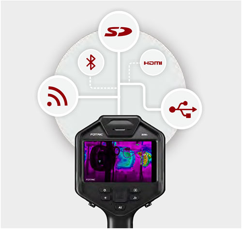 FOTRIC 320C系列紅外熱像儀提供豐富的數(shù)據(jù)傳輸接口,包含WiFi-FTP數(shù)據(jù)快傳,Type-C USB3.0有線傳輸,高速SD卡傳輸以及HDMI和藍牙接口。