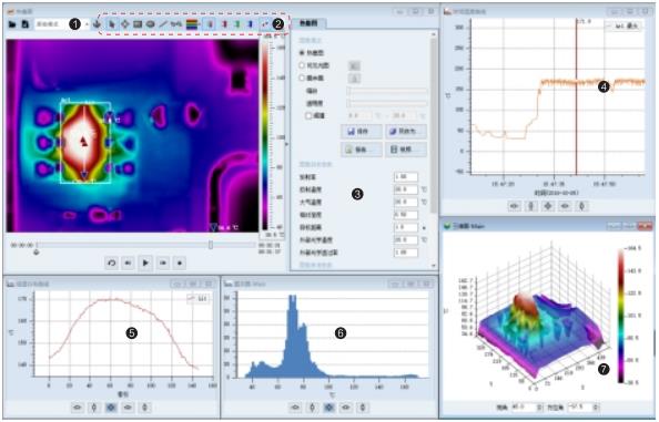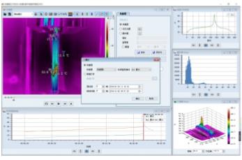 可對全輻射熱像視頻進行溫度趨勢分析、線溫分布分析、直方圖分析.三維圖分析等多種分析功能。如趨勢分析除可對點溫、最高溫.最低溫.平均溫隨時間變化分析外,還可以進行公式分析,如兩點溫度差隨時間變化,區(qū)域溫差隨時間變化,可進行不同樣品實驗視頻溫升同表對比分析等。