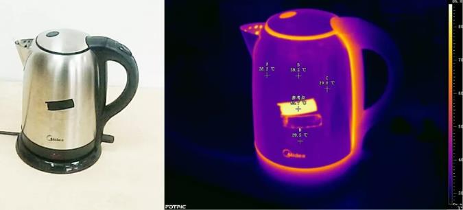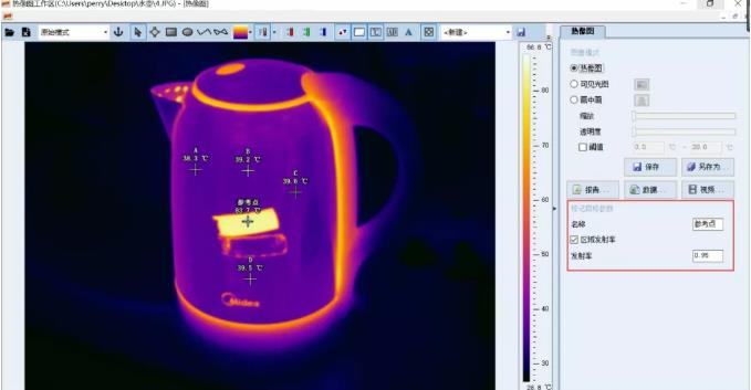 舉個(gè)例子,裝有熱水的不銹鋼水壺,因不銹鋼的發(fā)射率低,在熱像儀未設(shè)置發(fā)射率值的情況下,測(cè)出ABC三處溫度均在39℃左右,顯然不準(zhǔn)確。而貼有黑體膠帶的參考點(diǎn)處,溫度達(dá)到83.7℃,是準(zhǔn)確測(cè)溫。那么,除了貼黑體膠帶,還有哪些辦法能達(dá)到準(zhǔn)確測(cè)溫呢?