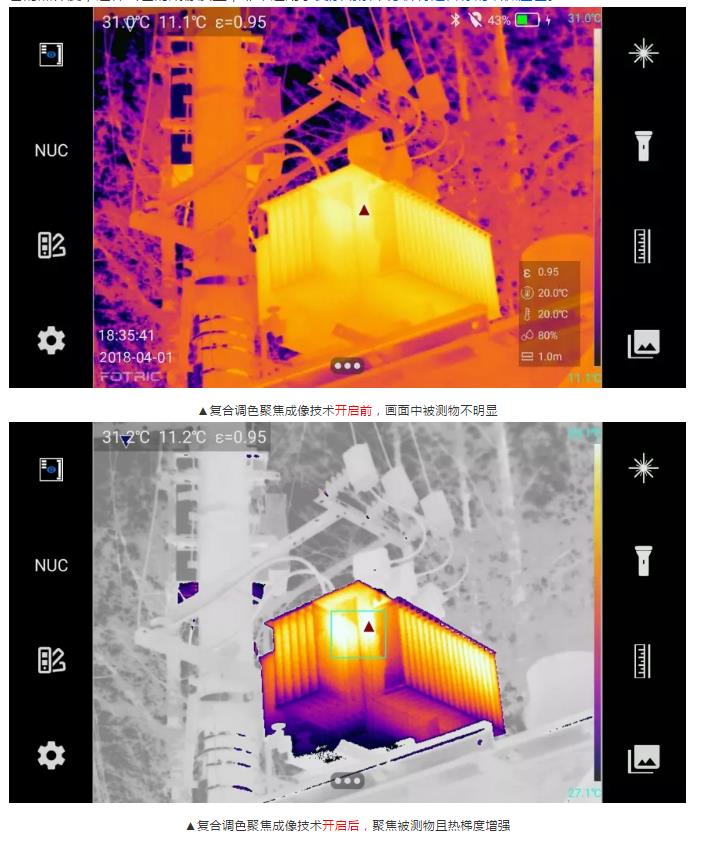 自主研發(fā)的“復(fù)合調(diào)色聚焦成像技術(shù)”,能在變壓器本身高溫的強(qiáng)干擾下,仍突出套管輪廓,增強(qiáng)顯示套管的熱梯度,這種出色的成像質(zhì)量,非常適用于復(fù)雜場(chǎng)景中分析特定目標(biāo)的細(xì)微溫差。